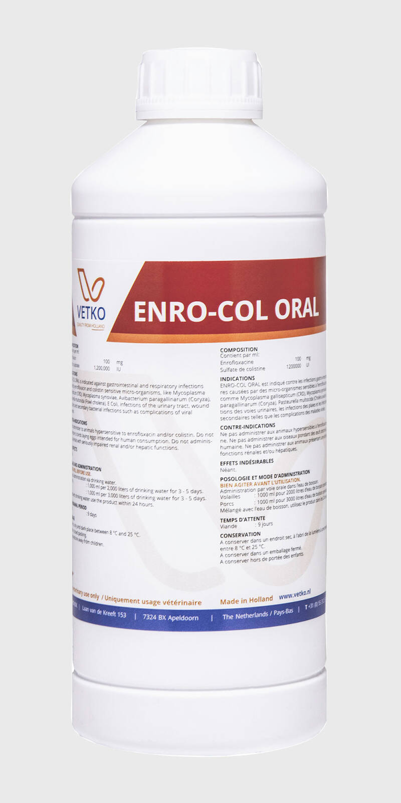 VETKO ENRO-COL ORAL is indicated against gastrointestinal and respiratory infections caused by enrofloxacin and colistin sensitive micro-organisms, like Mycoplasma gallisepticum (CRD), Mycoplasma synoviae, Avibacterium paragallinarum (Coryza), Pasteurella multocida (Fowl cholera), E Coli, infections of the urinary tract, wound infections and secondary bacterial infections such as complications of viral diseases.